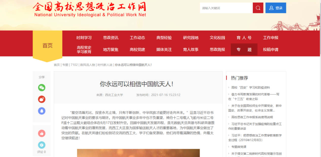 近日,球王会体育官方网飞行控制研究所研究生第二党支部2019级硕士研究生荣禄禄讲述中国人民解放军航天员群体模范事迹短视频在央视“时代楷模发布厅”、全国高校思想政治工作网、中国大学生在线等平台播出。“时代楷模”是中宣部组织的重大典型宣传项目,通过在中央广播电视总台央视综合频道制作播出《时代楷模发布厅》的形式,定期向社会发布重大典型人物事迹。