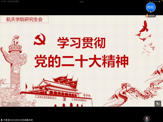 学习二十大,永远跟党走,奋进新征程。2022年10月16日上午,中国共产党第二十次全国代表大会在北京人民大会堂隆重开幕,习近平总书记代表第十九届中央委员会向大会作报告。10月25日晚,央视新闻发布二十大报告全文,球王会体育官方网球王会体育官方网研究生会按照疫情防控要求,于10月26日开展了党的二十大报告线上专题学习会。同学们认真学习党的二十大精神,开展了广泛而热烈的讨论。