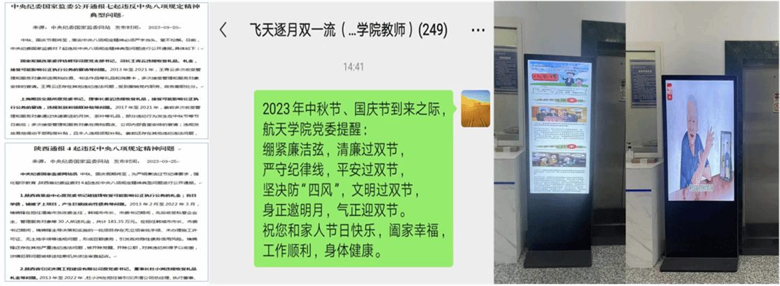 【强化意识 严守纪律】中秋节、国庆节来临之际,球王会体育官方网党委坚守节点,做好纠“四风”树新风工作,下发了近期中央纪委国家监委公开通报的违反中央八项规定精神典型问题、陕西省纪委监委公开通报的违反中央八项规定精神典型问题等案例开展学习,向党员领导干部、全体党员发送“中秋节、国庆节党风廉洁提醒”短信,在学院电子屏播放“@全体党员干部,这份清廉过节指南请查收”、“清廉家风丨有国才有家”等教育警示图片和视频,营造清廉过节的浓厚氛围,增强遵守党纪国法意识,夯实干事创业思想基础。