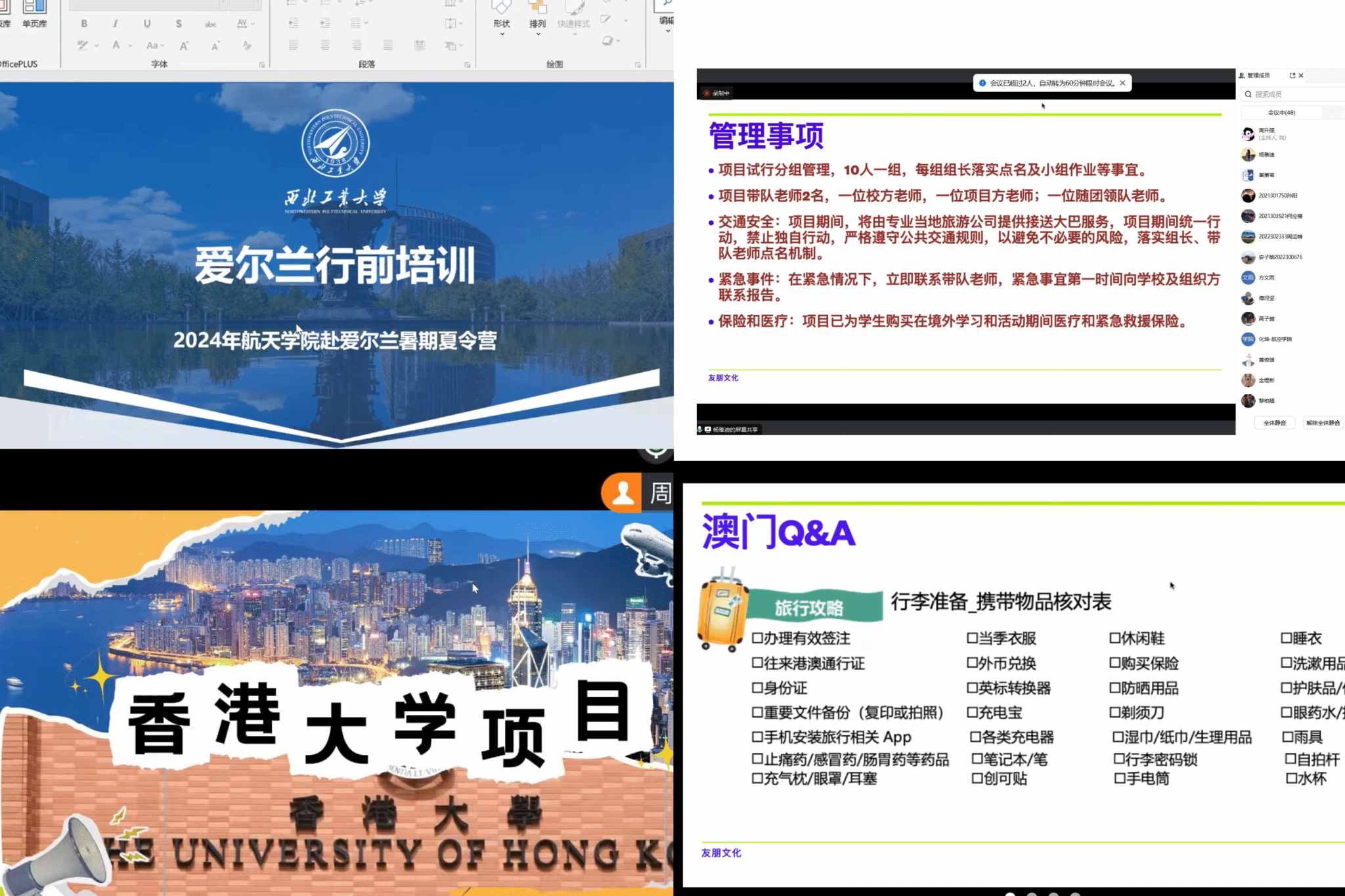 2024年暑假期间,球王会体育官方网共组织开展5个短期出国(境)项目,分别为球王会体育官方网英国剑桥大学-莱斯特大学暑期项目、爱尔兰高威大学暑期项目、香港大学暑期项目、香港理工大学暑期项目、澳门科技大学-澳门大学暑期项目。为进一步强化学生涉外礼仪及安全防范意识,更好适应境外短期学习、生活,在学校国际合作处“平安留学”行前培训基础上,球王会体育官方网各项目团队,以项目目的地国别及地区实际情况为基础,在7月6日-14日期间,召开4场行前培训会,考虑到暑假期间学生位置分散各地,培训会均以线上形式召开,行前培训由各项目带队老师负责,项目团队所有学生参加。