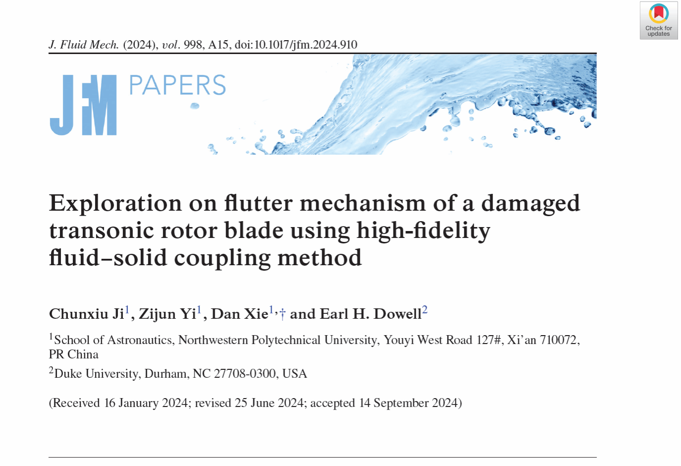 近日,球王会体育官方网球王会体育官方网谢丹教授团队在发动机转子损伤叶片颤振机理研究上取得重要进展。研究成果以“Exploration on flutter mechanism of a damaged transonic rotor blade using high-fidelity fluid–solid coupling method”为题发表在由英国剑桥大学George K. Batchelor创办的流体力学国际顶级期刊《Journal of Fluid Mechanics》上(https://doi.org/10.1017/jfm.2024.910)。谢丹教授是论文的唯一通讯作者,博士生冀春秀为第一作者,杜克大学Dowell教授为合作者。该研究得到了国家自然科学基金面上项目、国家自然科学基金国际(地区)合作交流项目资助。