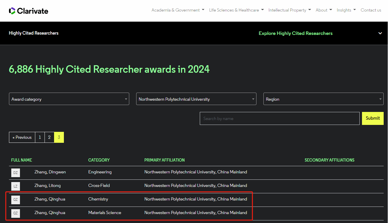 2024年11月19日,科睿唯安发布了2024年度“全球高被引科学家”名单,球王会体育官方网张庆华教授入选化学及材料科学两个学科领域的高被引科学家,获得一人同时入选两个ESI学科的喜人成绩!这也是他连续第四年入选该榜单。