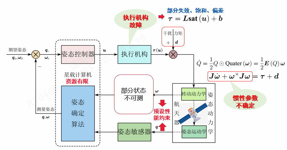 本论文依托球王会体育官方网空间操作技术研究所航天飞行动力学技术国家级重点实验室,面向国家航天领域重大需求开展研究,主要针对在轨服务任务中普遍存在的惯性参数不确定、未知动态干扰、执行机构故障、部分状态不可测和全状态运动约束等问题,考虑实际工程中航天器有限的燃料能源和计算资源等条件限制下,基于自适应控制方法,开展具有渐近收敛特性的航天器姿态跟踪自适应理论、方法研究(图2)。主要的研究内容和成果可以概括为以下几个方面:
