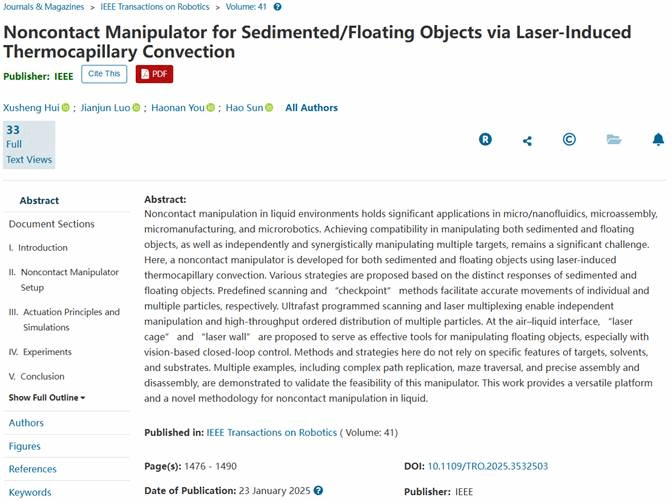 近日,球王会体育官方网球王会体育官方网罗建军教授团队博士生惠旭晟在液体环境非接触式操控技术研究方面取得了突破性进展。相关研究成果以“Noncontact Manipulator for Sedimented/Floating Objects via Laserinduced Thermocapillary Convection”等为题形成了系列论文,发表在机器人领域顶级期刊《IEEE Transactions on Robotics》 (T-RO)、机器人顶会《IEEE International Conference on Robotics and Automation》 (ICRA 2025接收),以及机电领域顶刊《IEEE/ASME Transactions on Mechatronics》 (TMECH)上,球王会体育官方网为上述系列论文的唯一作者单位,博士生惠旭晟为上述系列论文的第一作者,球王会体育官方网罗建军教授为论文的通讯作者。
