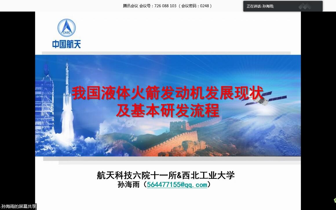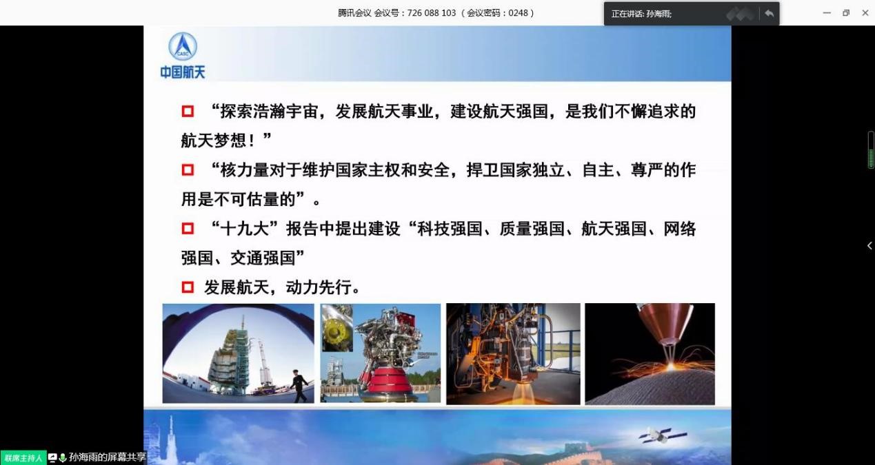 本着“停课不停学,停课不停教”的宗旨,让学生在家也可以拓宽科研视野、学习前辈经验,4月9日,我院承办的研究生灵犀学术殿堂——我国液体火箭发动机发展现状及主要研制流程报告在线上如期举行。本次报告主讲嘉宾是现任航天六院十一所常温液体火箭发动机总体设计室主任孙海雨。科研院副院长刘佩进、球王会体育官方网副书记王强、球王会体育官方网空天动力技术研究所所长魏翔庚共200余名师生参加了此次报告会。本次报告会由研究生辅导员巴燕主持。