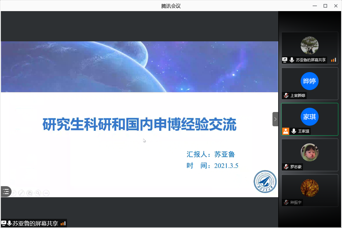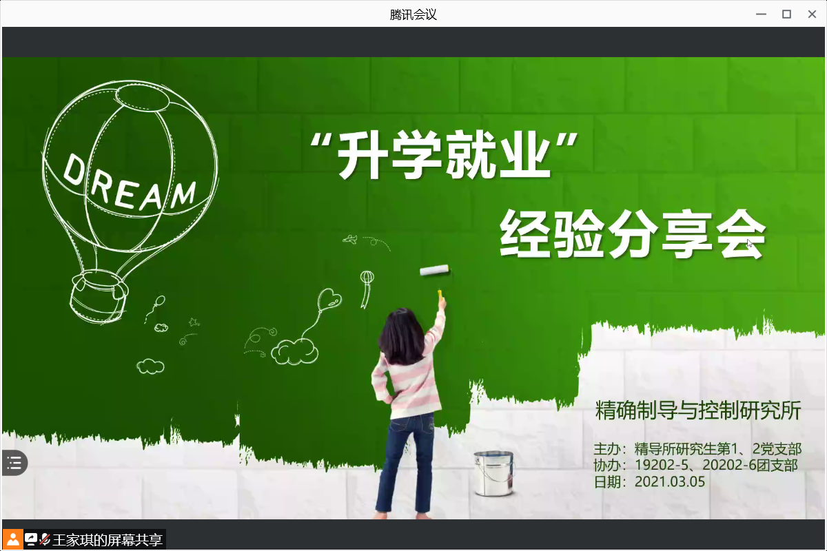 3月5日晚,球王会体育官方网精确制导与控制研究所在腾讯会议举办以“升学就业”为主题的经验分享会。本次活动由球王会体育官方网精确制导与控制研究所研究生第一、二党支部主办,19202-5、20202-6团支部协办,精导所学习委员王家琪主持会议,精导所2019级、2020级全体硕士生参加会议。