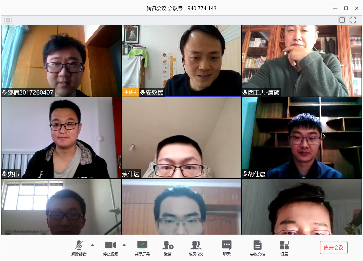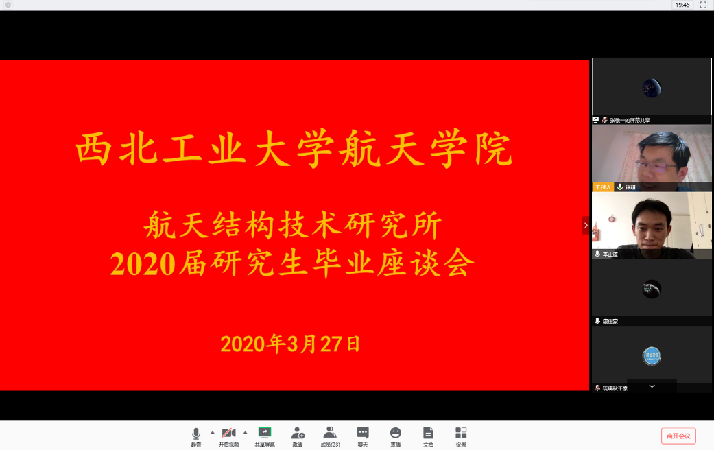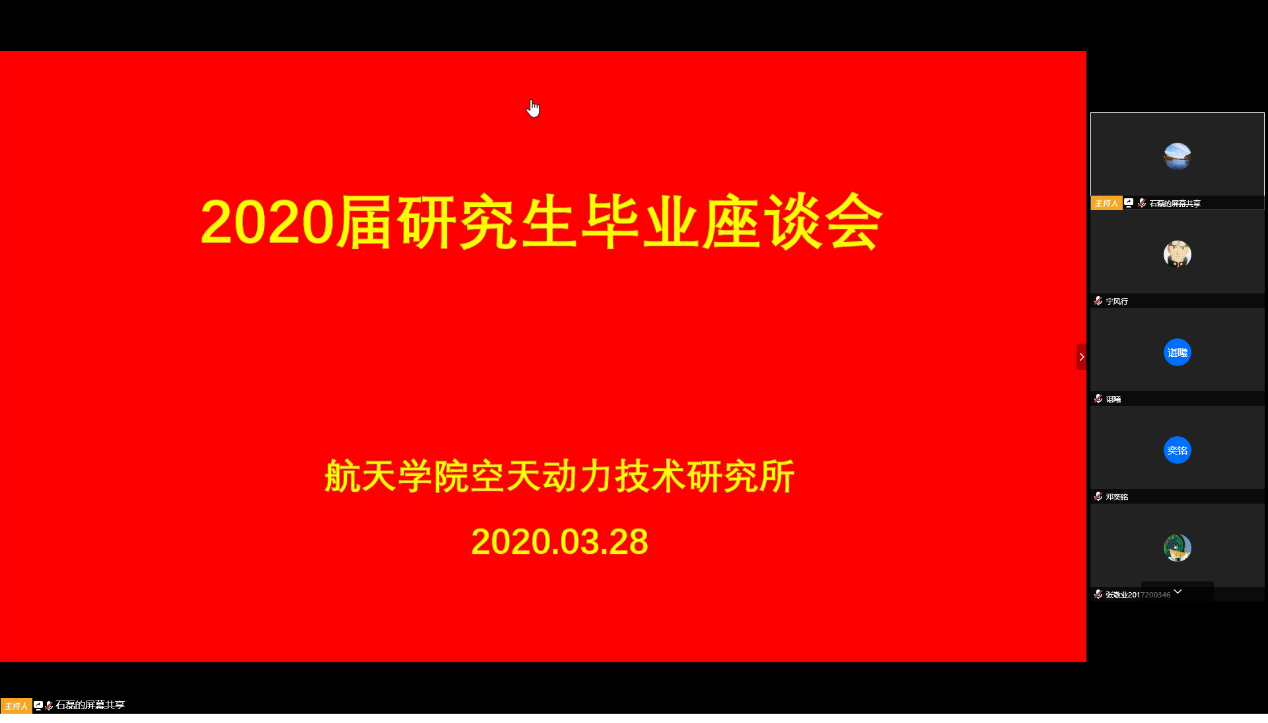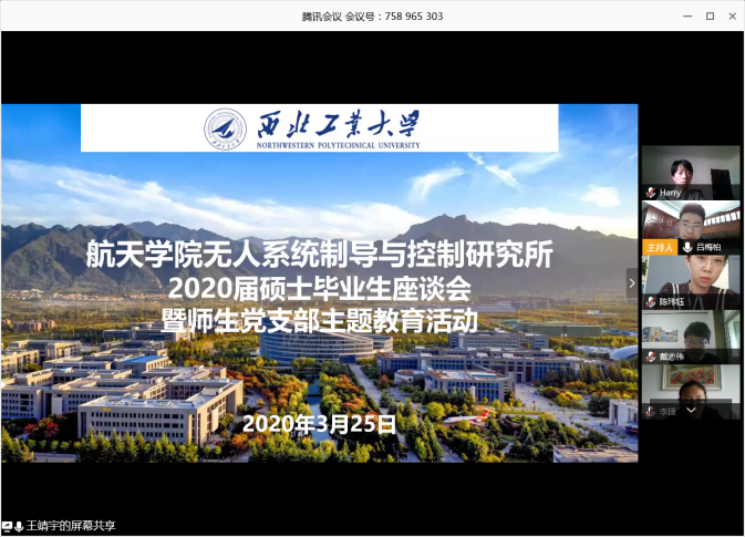 2020年3月25日至4月2日,球王会体育官方网按照学校要求,以研究所为单位组织召开了“感恩工大情 激扬爱国志”2020届研究生毕业座谈会,学院领导、研究生导师和2020届毕业研究生共同参加。
