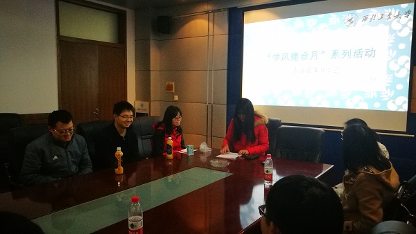 2018年12月14日晚,由球王会体育官方网主办,18202-4班承办的学风建设月系列活动之青春故事分享会”在1号楼二楼会议室召开,活动主讲人为研究生标兵魏才盛,国家奖学金获得者赵亚坤和张光辉。
